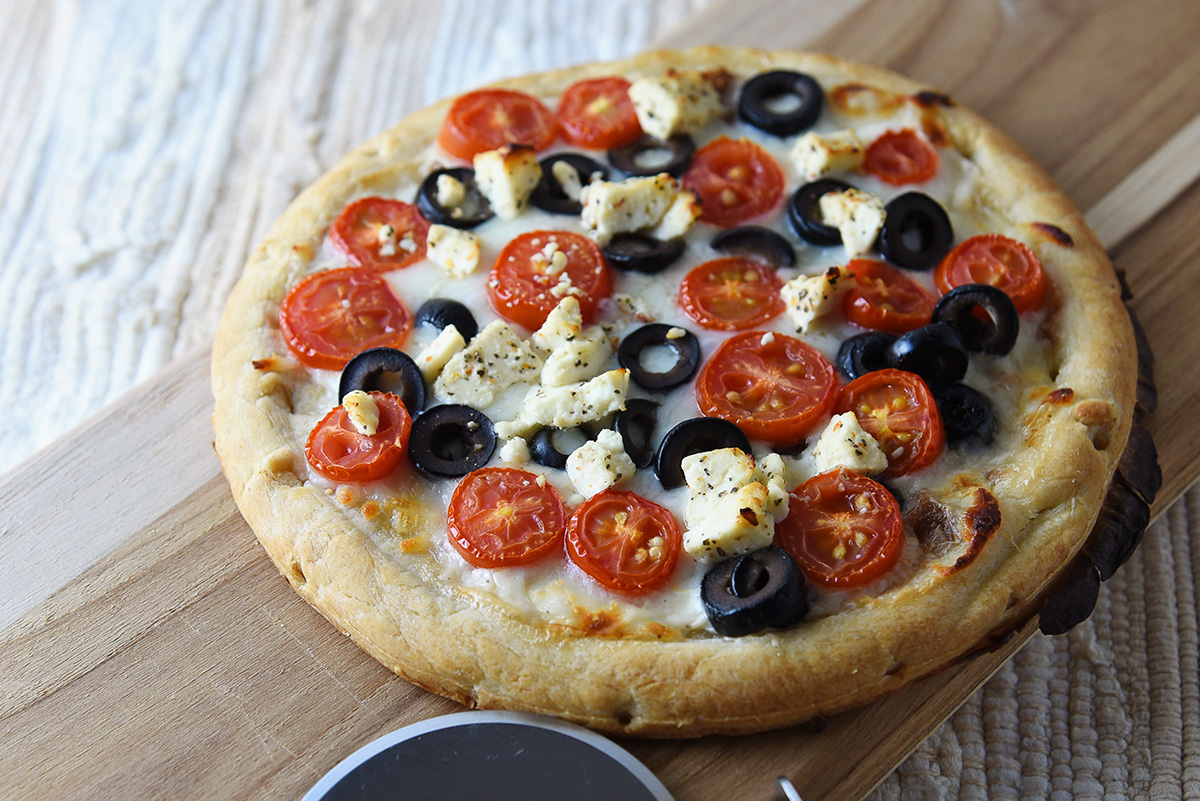 - Spread Alfredo sauce on crust, top with mozzarella cheese, olives, sliced tomatoes, and feta cheese.