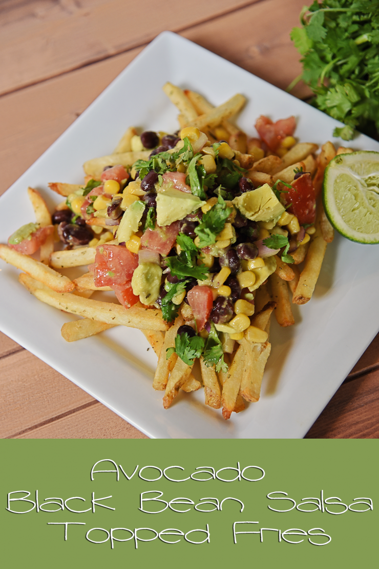 I made this Avocado Black Bean Salsa the other day. I thought I would mix it up and top the new Rosemary Fries from Alexia with it instead of serving with chips. It turned out amazing!