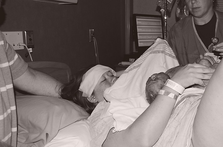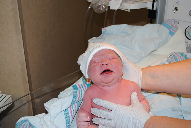 We arrived at the hospital at 7am to be induced. After 3 unsuccessful tries to get my IV they finally got it in on the 4th try. I once again was already having contractions. This time though I was actually 1cm dilated and 40% effaced. The doctor arrived around 10am and then they started the pitocin. At 12pm I was 2cm and the contractions started getting stronger and more consistent. She broke my water at 4:30pm. After this my contractions became very, very strong. She checked me again around 8pm (I think) and I was almost 5cm. After this everything is kind of a blur. The contractions were very close and strong. They didn’t turn up the pitocin anymore. I was not getting any rest in between contractions.