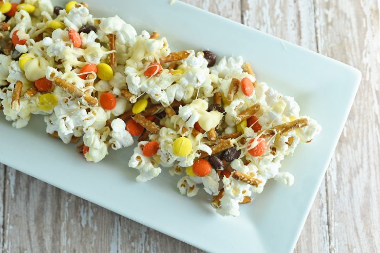 - Pour over popcorn and add the broken up pretzels and reese's pieces.
