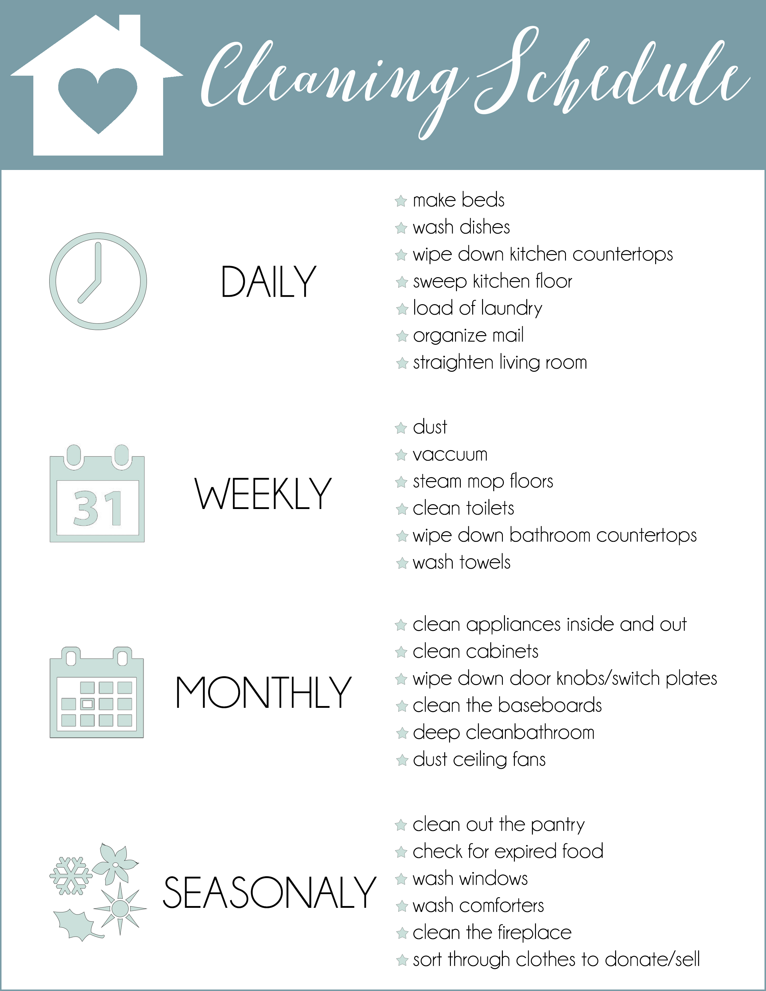 Are you like me, and find cleaning to be overwhelming and time-consuming? I let it build up so much that when I do get time to clean up my entire house is destroyed and I don’t even know where to start. I want to try to get into a good cleaning routine. I feel if I take on a little bit at the time and have a list it will help me feel a little less stressed. I made a free cleaning schedule printable to help me and thought I would share it with you all too.
