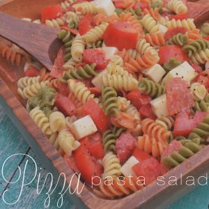 The Pizza Pasta Salad is perfect to make ahead the night before. Then you can just grab it and go to a tailgate party. Or pull it out before a game you are watching at home. This salad really compliments the hot wings. A good way to cool off after chowing down on some wings.