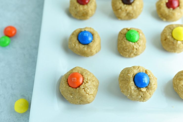 - Roll into 1 inch balls and top with Peanut Butter M&Ms.