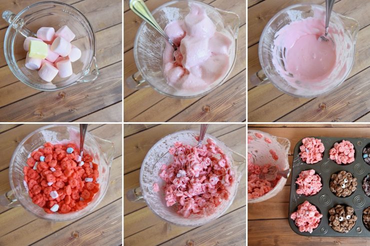 - Melt 1 tablespoon of butter and the strawberry marshmallows for 1 minute in the microwave. Add the Franken Berry® cereal. Take a spoonful or two and place in a muffin tin. Add the candy eyeballss on the top of each ball.
