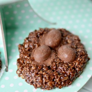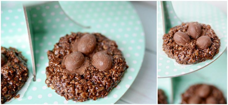 I decided to make my famous no bake cookies into little Nests to hold a few of the NestEggs. I made some with the BUTTERFINGER® NestEggs and others with the CRUNCH® NestEggs. I think they turned out really cute. They are pretty delicious too!