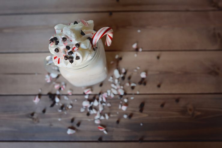 Top with whipped cream, crushed candy cane, and chocolate chips.