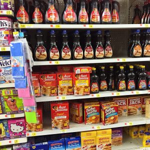 I found everything I needed for this pumpkin spice pancake recipe at Walmart in the breakfast aisle and in the seasonal shelves in the middle of the main aisle.