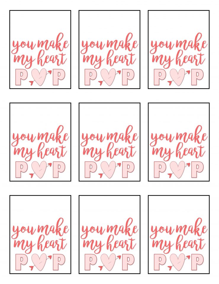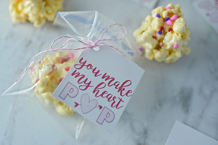 I put the popcorn balls in small ziploc bags so they would stay fresh for longer. Then attached the You Make My Heart Pop tag using pink twine.